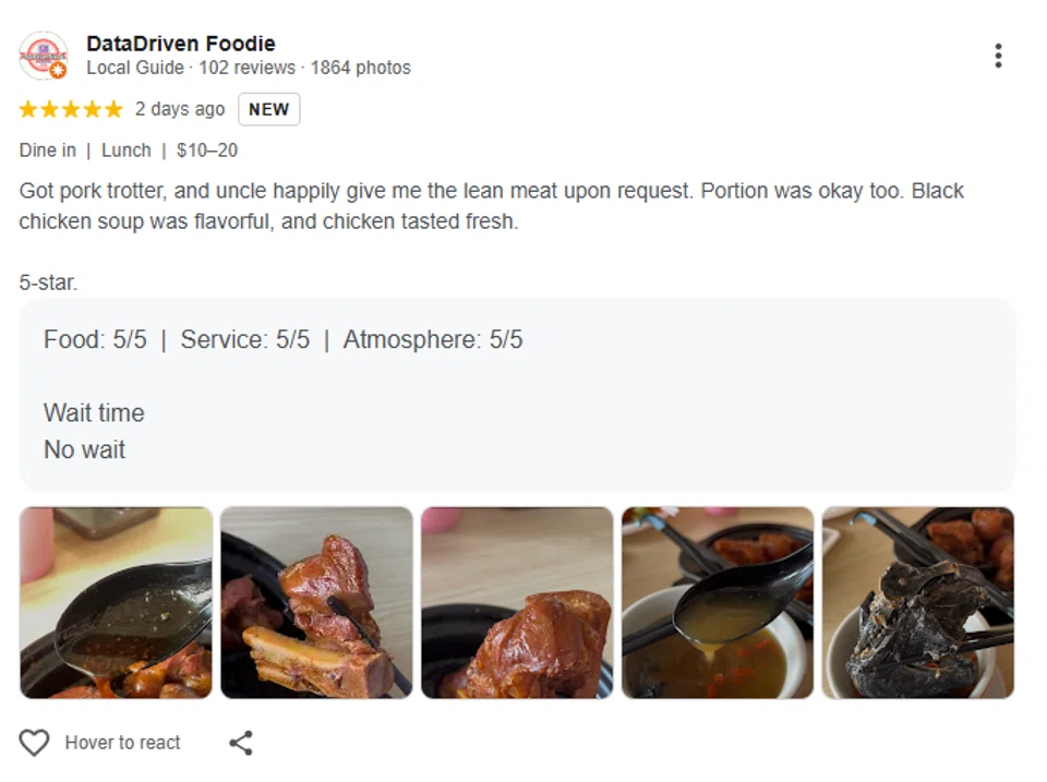 "Now as I'm tasting the soup itself, it's not bland at all, there's flavour," said Data Driven Foodie. "The pig trotters are tender, and by all means it's not a one star."