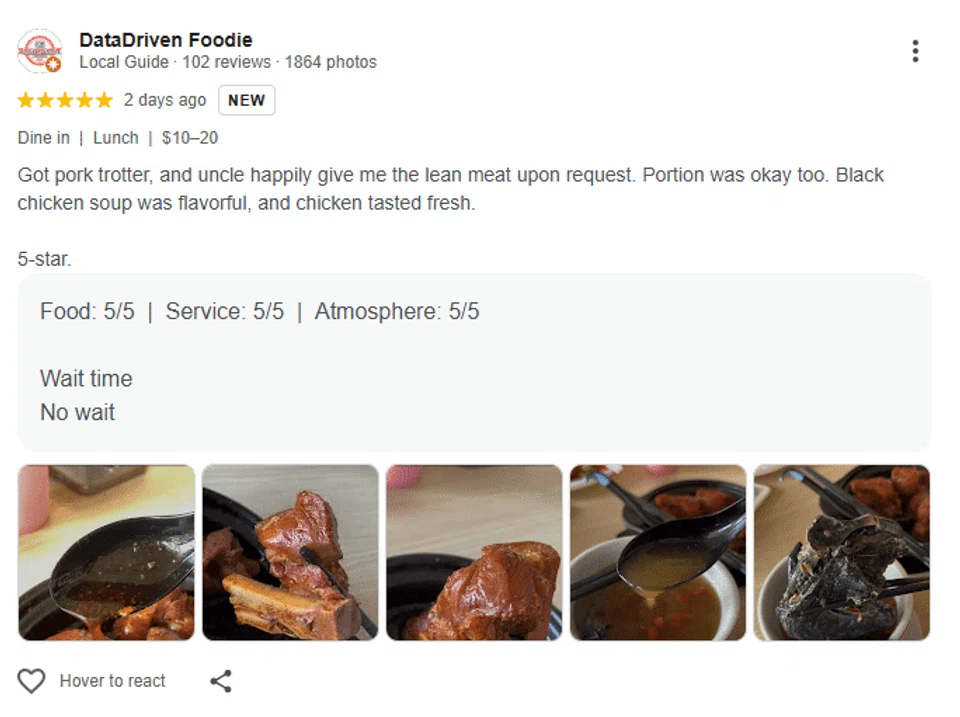 "Now as I’m tasting the soup itself, it’s not bland at all, there’s flavour," said Data Driven Foodie. "The pig trotters are tender, and by all means it’s not a one star.”