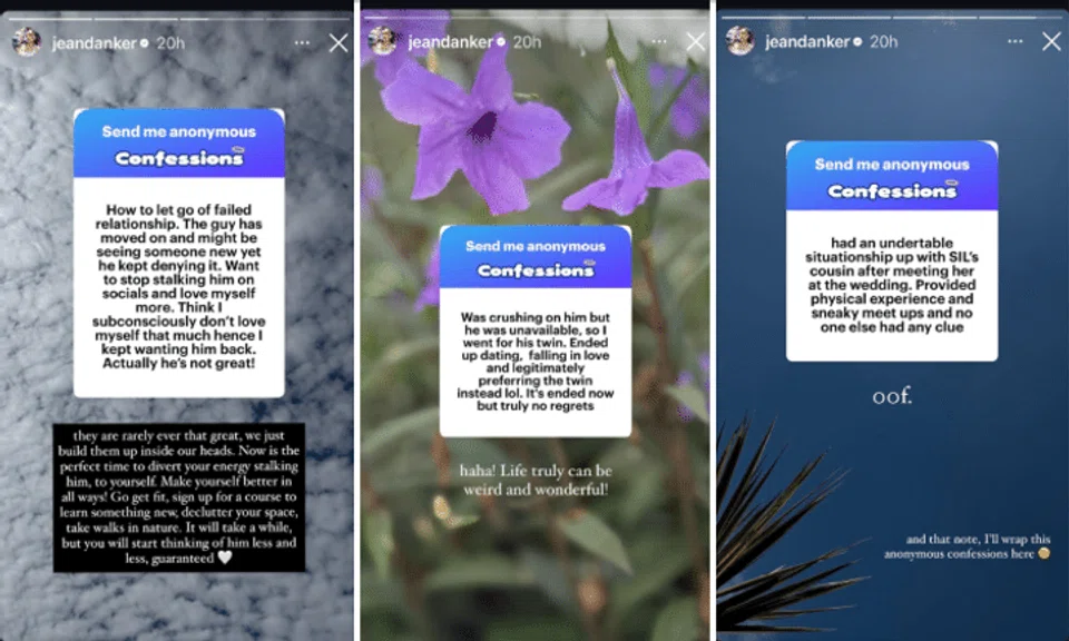 Mediacorp radio DJ Jean Danker recently went on Instagram Stories to give relationship advice to people who sent her "anonymous confessions".