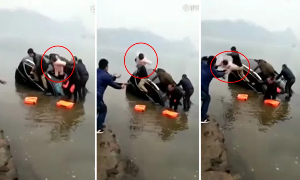 Desperate dad on sinking car throws infant daughter to onshore onlookers in China