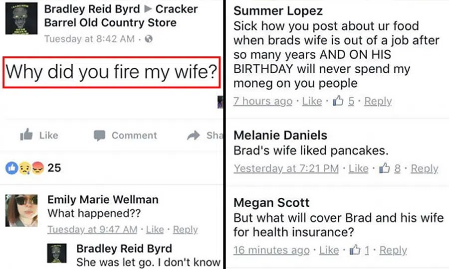 According to Bored Panda, the concerned husband named Bradley Reid Byrd left a comment on the Facebook profile of restaurant chain 'Cracker Barel' asking 'why did you fire my wife?'.