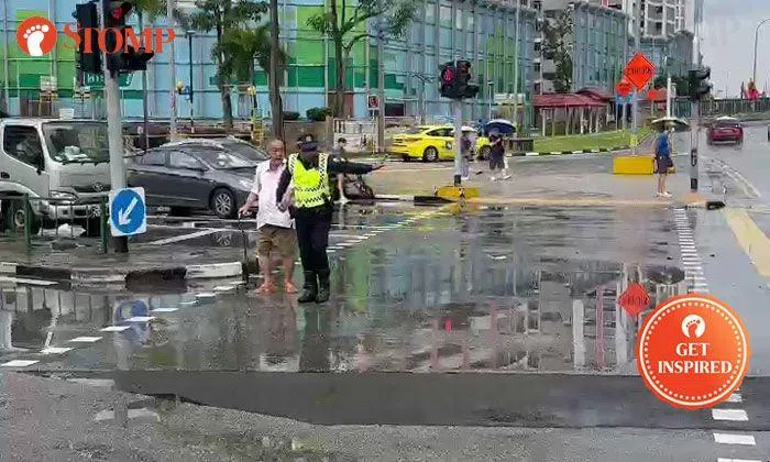 Aetos officer helps elderly man cross road in Ang Mo Kio despite being drenched by rain