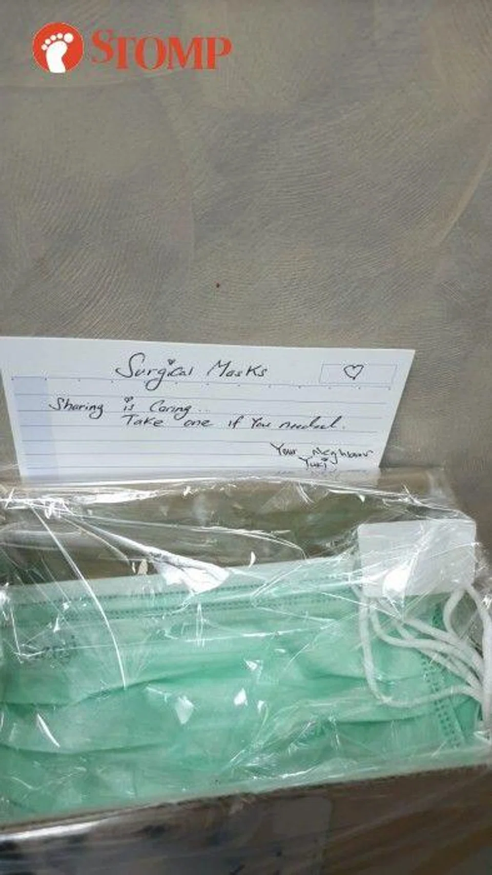 Similarly, Stomper Jasman shared with Stomp the kindness of a resident at Block 161 Punggol Central who left surgical face masks in the lifts for others to use.