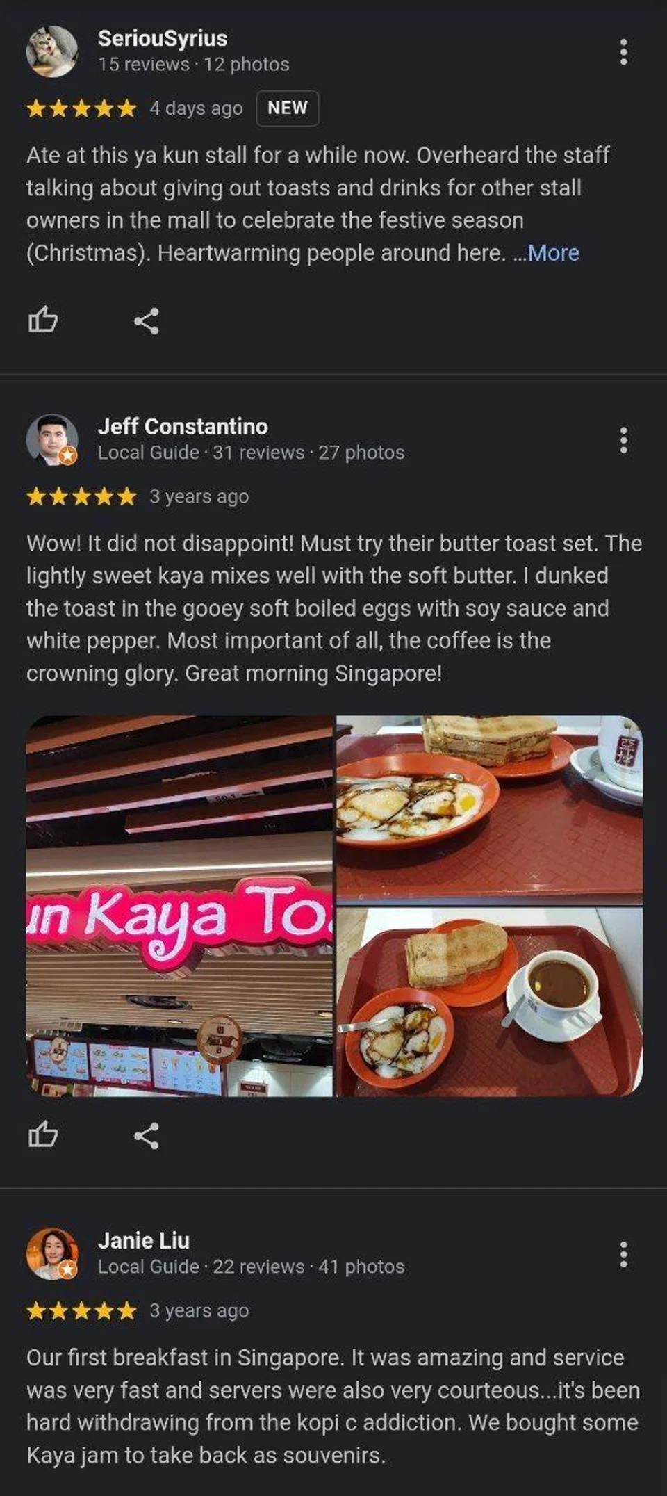 The Stomper added that the Google reviews of the Ya Kun Kaya Toast at Hong Leong Building have commended the service and the food.