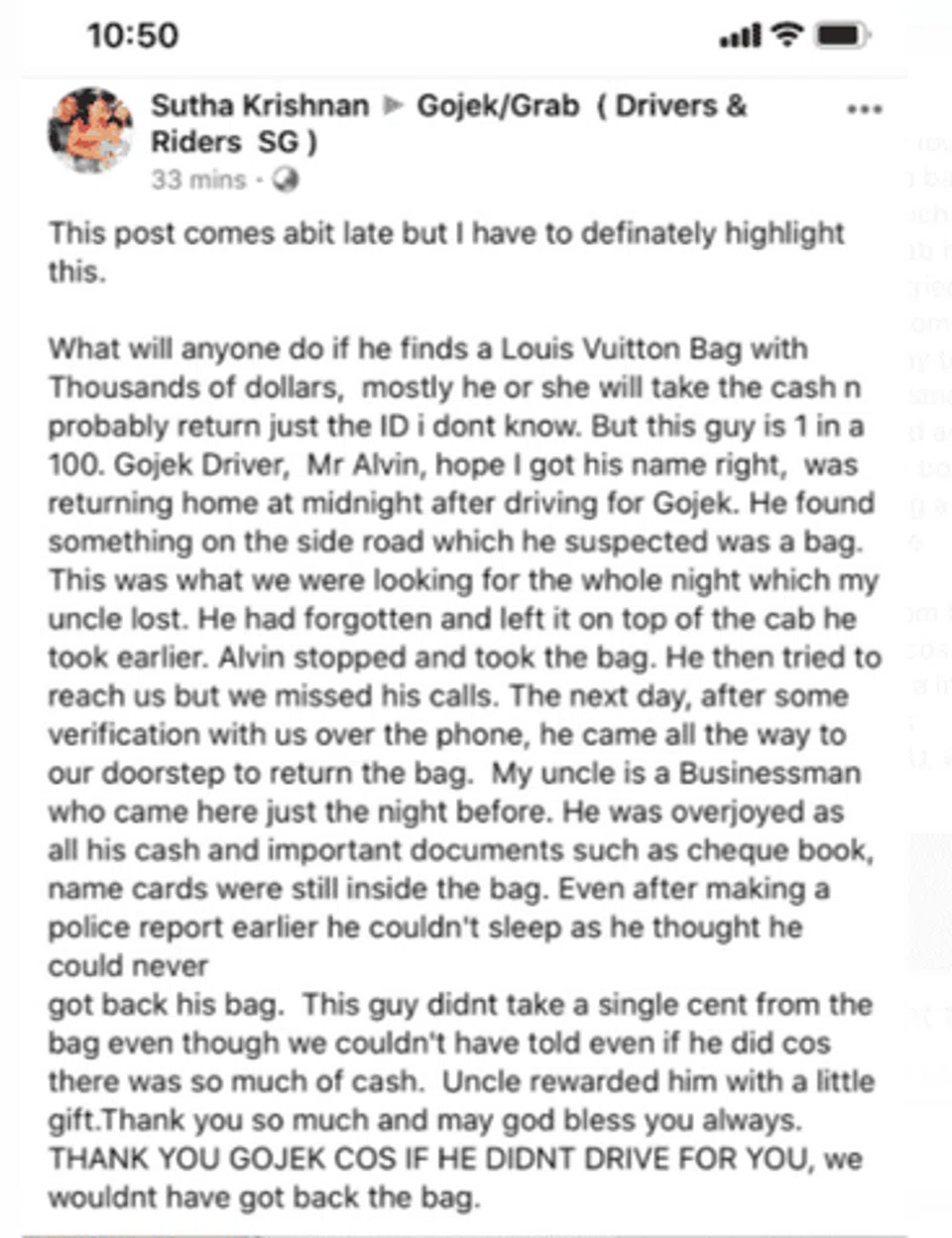 Sutha wrote: "He was overjoyed as all his cash and important documents such as cheque book, name cards were still inside the bag."