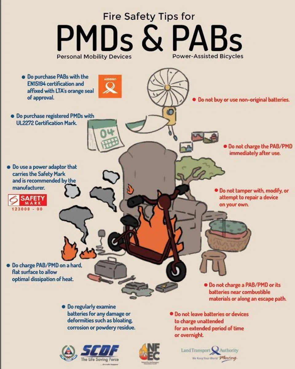 SCDF reminds the public on the prevention of personal mobility device (PMD)/PAB fires, including not charging batteries for an extended period of time or overnight.