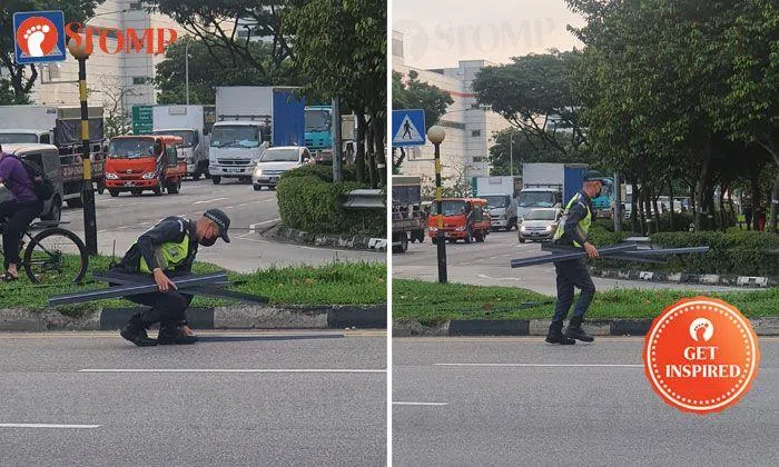 Stomper Masnoh shared with Stomp photos he took of the officer picking up metal trunking at about 7.30am.