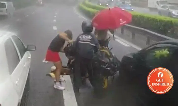 A group of road users banded together to help a rider who had skidded and fallen on the expressway during a downpour this morning (Sep 15) at around 8.45am.