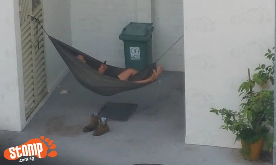 Stomper Jasmine was amused when she saw a man resting in a hammock he set up at the foot of Block 372 Bukit Batok Street 31 yesterday (Jan 5).