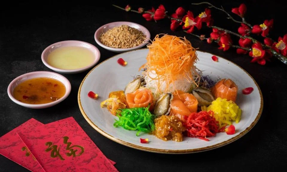 Ring in the New Year with EN Group's Prosperity Yu Sheng, featuring a vibrant mix of shredded vegetables, crushed peanuts, and pok chui crackers, ready to be savoured with a housemade yuzu honey and plum sauce.