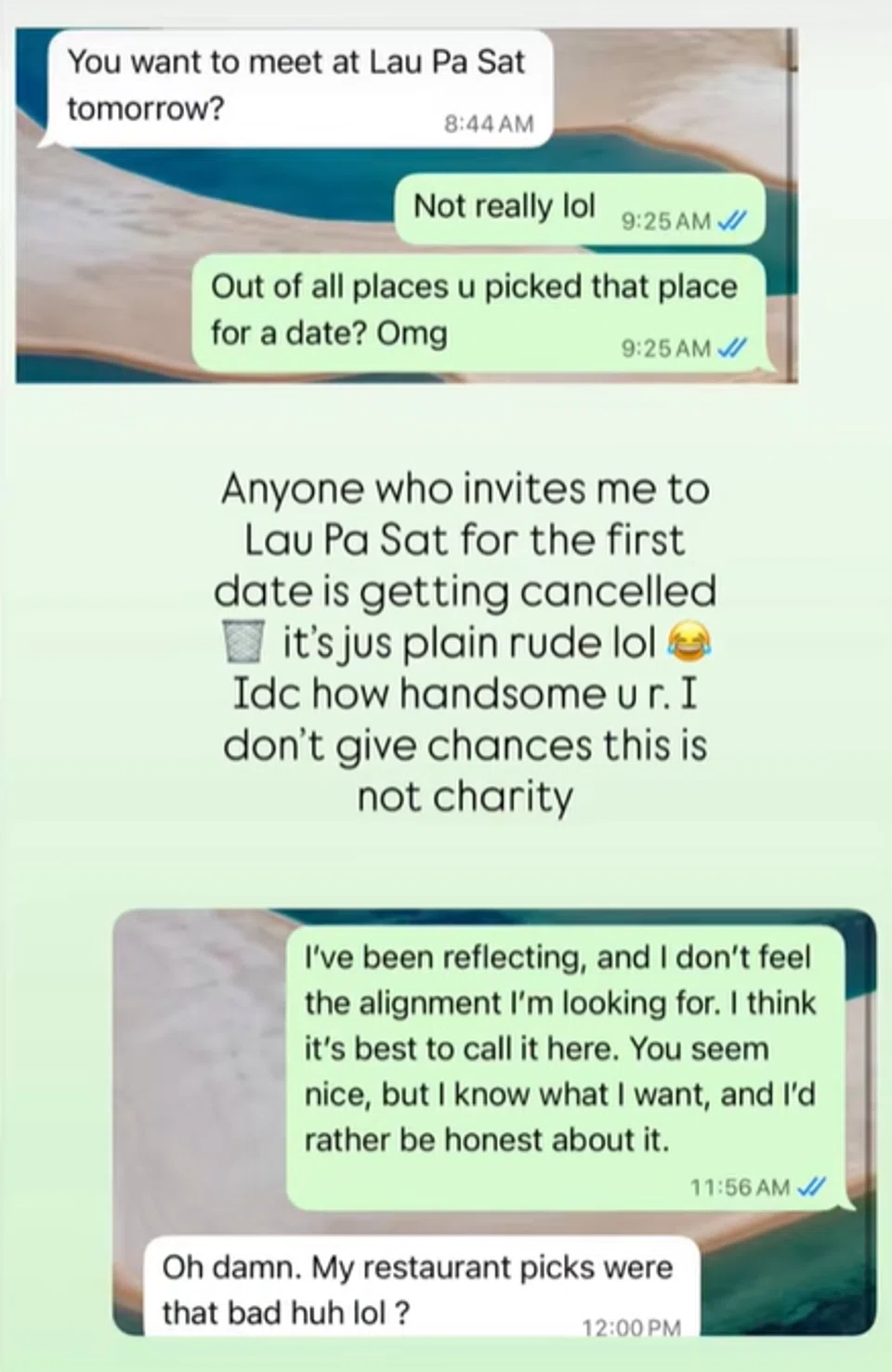 In the caption, she added that anyone who invited her to Lau Pa Sat for a first date would be "cancelled".