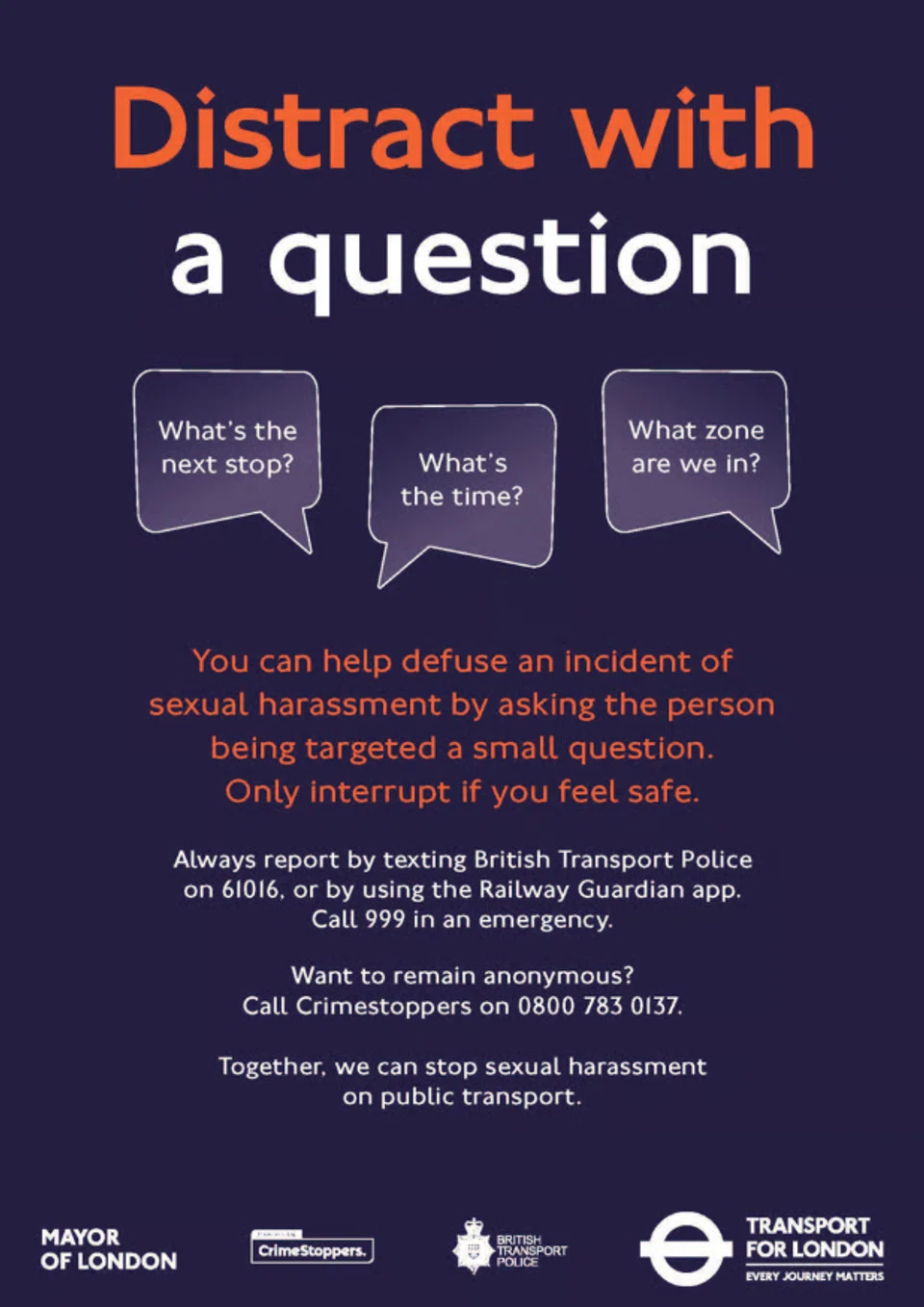 In contrast, the posters on London's subway - commonly known as the Tube - advise individuals experiencing sexual harassment to "distract with a question".