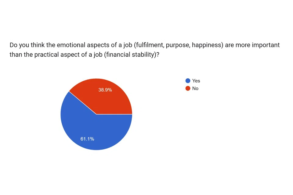 In fact, 61.1 per cent of respondents said the emotional aspects of a job - such as finding purpose and happiness in their work - are more important than practical considerations like financial stability.