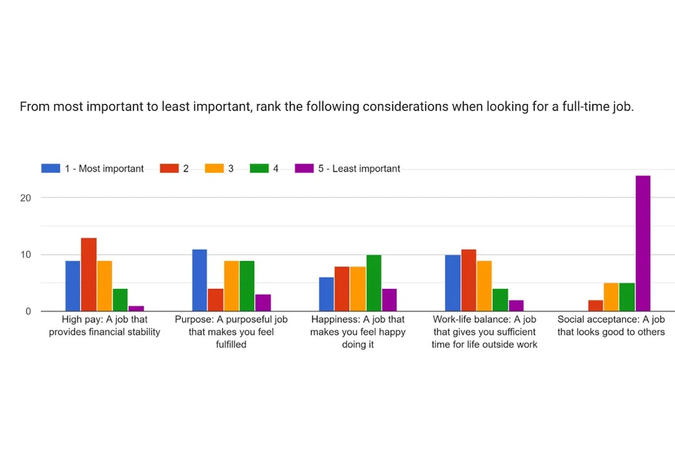To understand these changing concerns, The New Paper conducted a survey of university students and fresh graduates aged 19 to 25. The survey found that many young job hunters now prioritise purpose and happiness over a high-paying job.