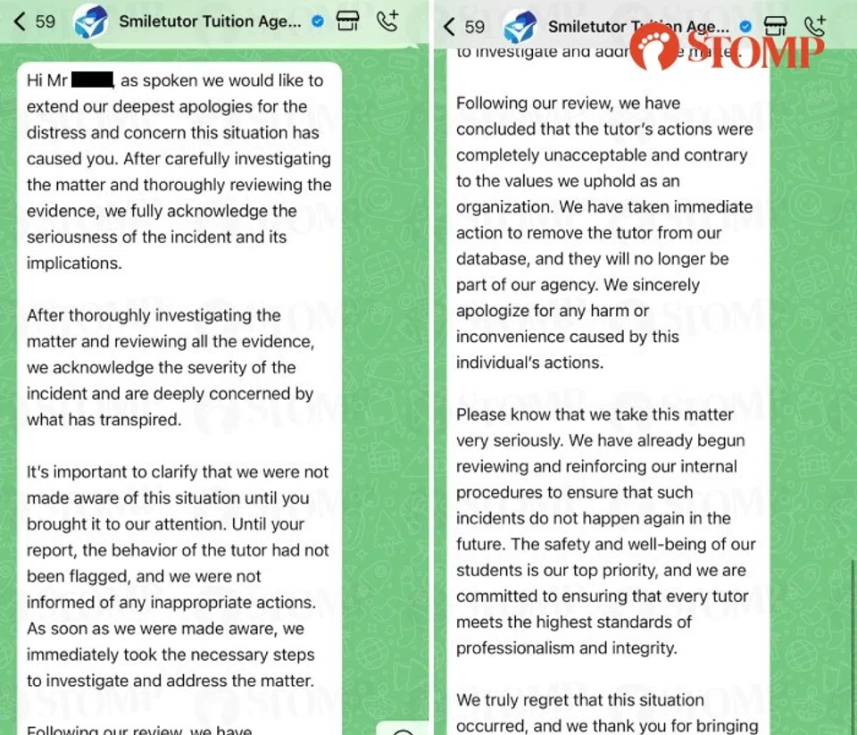 The parent informed the tutor's agency, SmileTutor, who apologised for the situation.
