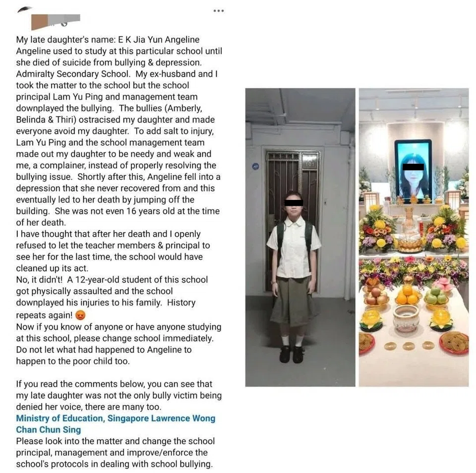Separately, a Facebook post on Jan 8 alleged that a 15-year-old girl from Admiralty Secondary School had died by suicide in 2023 after experiencing bullying and depression.