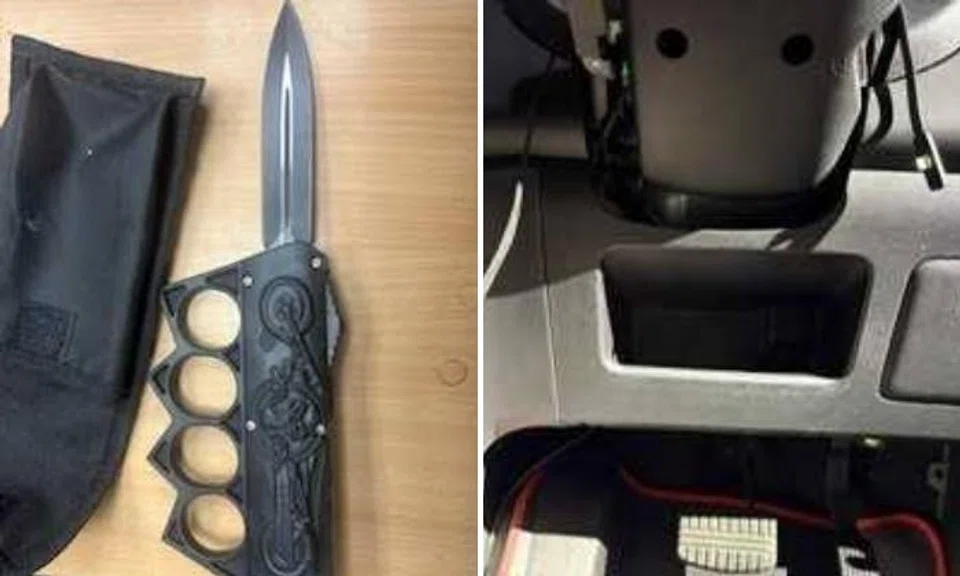 After the vehicle was directed for enhanced checks, Immigration & Checkpoints Authority (ICA) officers uncovered a dual-function weapon - flick knife combined with knuckle duster - inside a compartment under the steering wheel of the car.