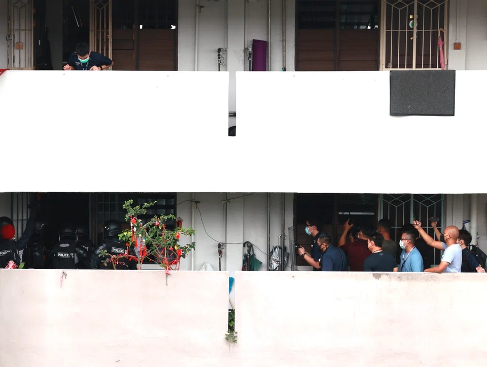 Chinese evening paper Shin Min Daily News reported that a police officer was seen holding a shield and speaking to the people inside the unit at the door.