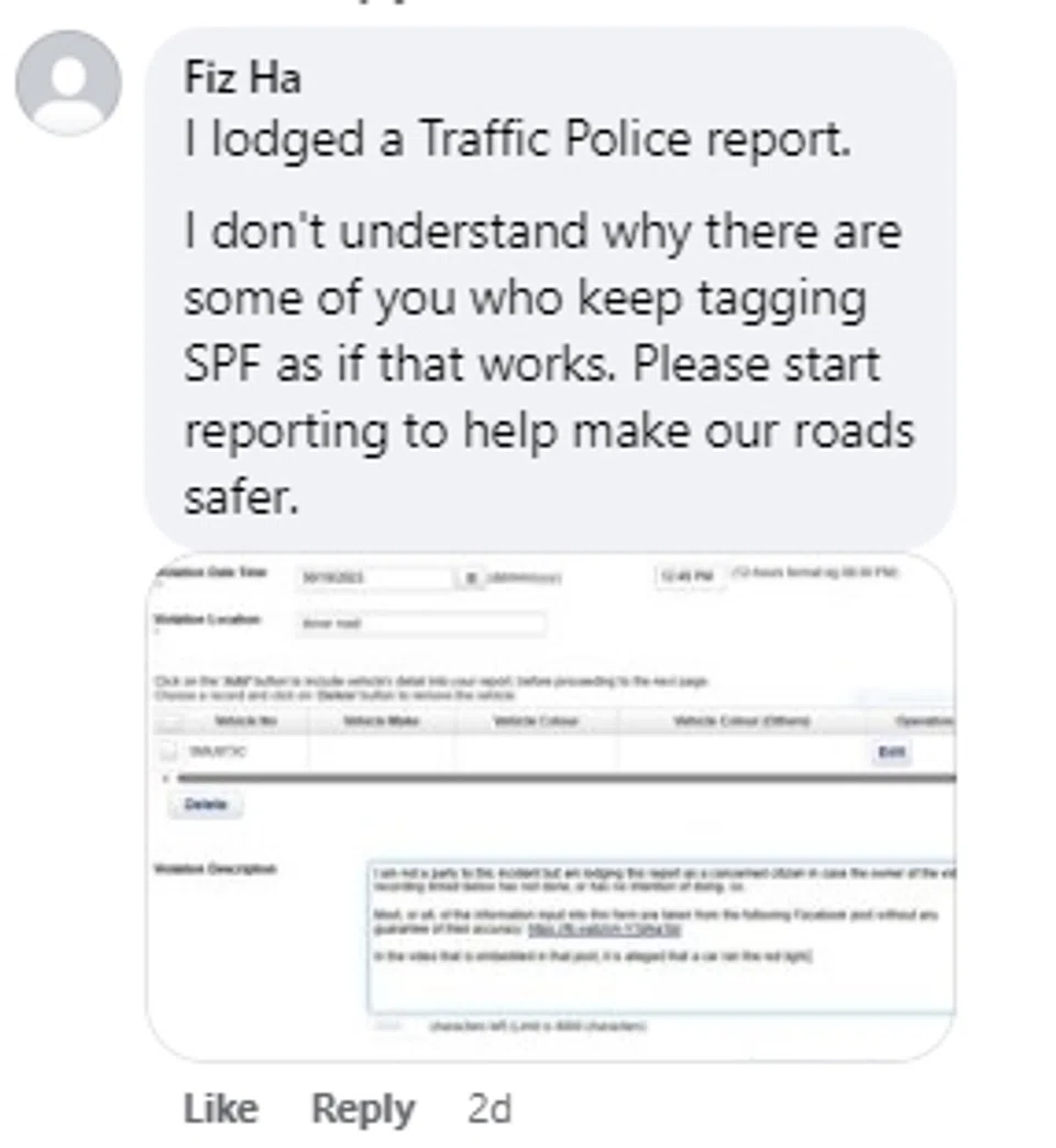 In the comments, a Facebook user said he had lodged a Traffic Police report.