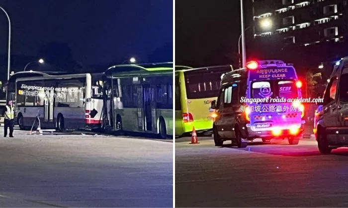 Photos of the incident’s aftermath posted on the Singapore Roads Accident.com Facebook page show the front of a green bus wedged against the rear end of a white bus. At least two SCDF ambulances are also seen at the scene.