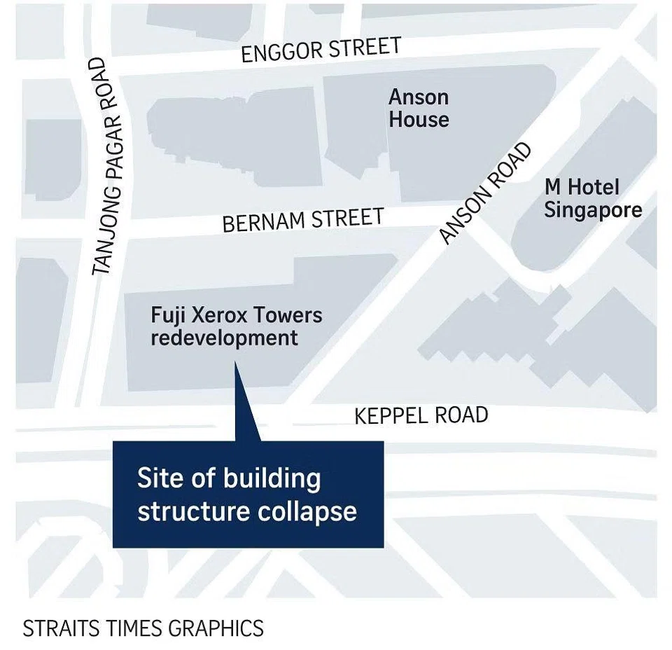 In photos sent to The Straits Times by a reader, debris from the collapse can be seen in Bernam Street, off Anson Road. The area also appeared to have been cordoned off.