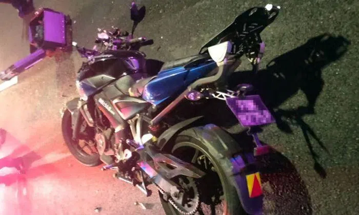 Photos circulating on Telegram show the fallen motorcycle, which had a probationary P-plate, lying on the road.