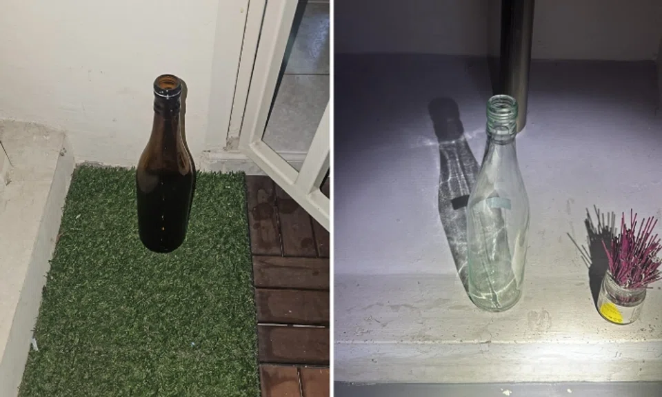 In the second case, the police were alerted at 6.35pm that an unknown liquid believed to be turpentine was splashed at the doorway of a Marsiling Rise flat and a debtor's note was left on a shoe rack beside the doorway.