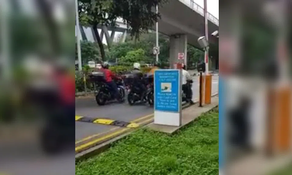The video shows four motorcyclists lining up in a row at the gantry of a carpark. All four motorcyclists then proceeded to exit the carpark when the gantry was raised.
