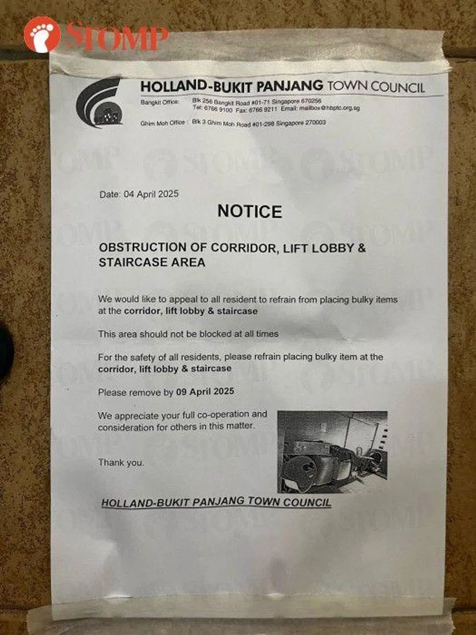 In response to a Stomp query, Holland-Bukit Panjang Town Council said it engaged and issued advisory notices to four households in April 2025 regarding obstruction caused by potted plants and personal items along the common corridor.