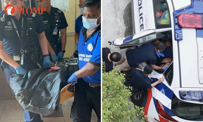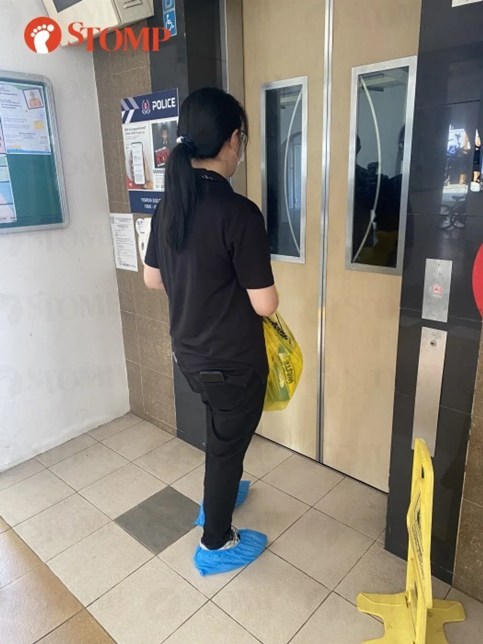 A police officer in gloves and boot covers was seen going up the lift of Block 803 at about 11.55am. She was holding a yellow plastic bag labelled 'waste', but its contents were unidentifiable.