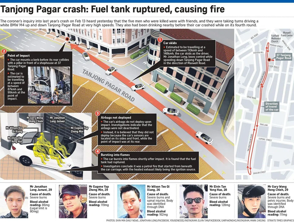 The coroner's inquiry into the deaths of five men who were in a fiery car crash in Tanjong Pagar on Feb 13 last year heard that the white BMW M4 had hit speeds of up to 181kmh.