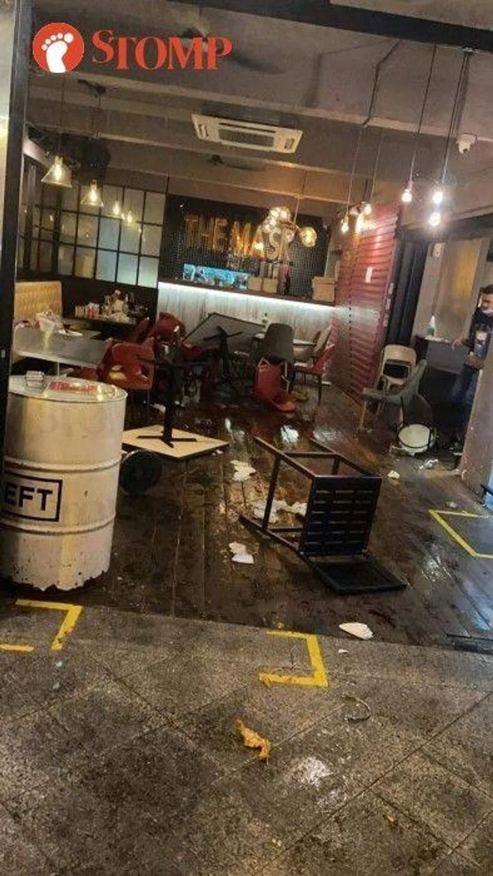 Overturned tables and chairs are seen strewn all over the restaurant.