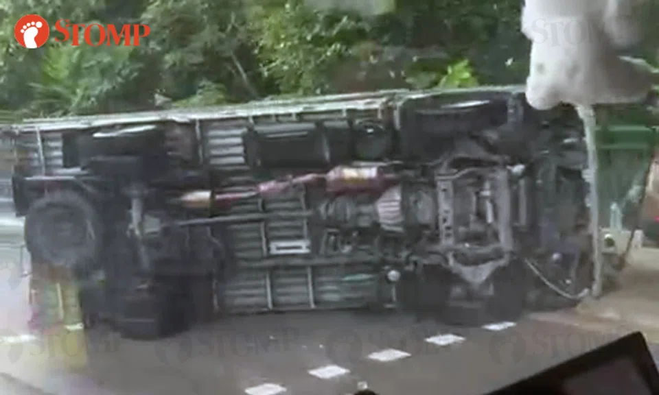 Stomper Lim shared a video showing a lorry lying on its side on the wet road and a police car at the scene.