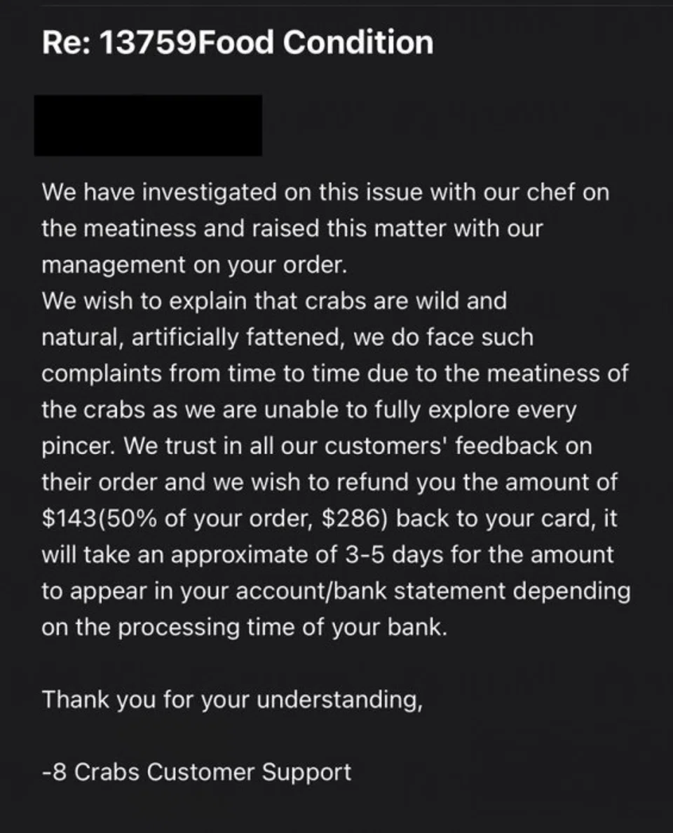 Following the underwhelming meals, they voiced their concerns on 8 Crabs' Facebook page in hopes that the quality of crabs would be improved.
