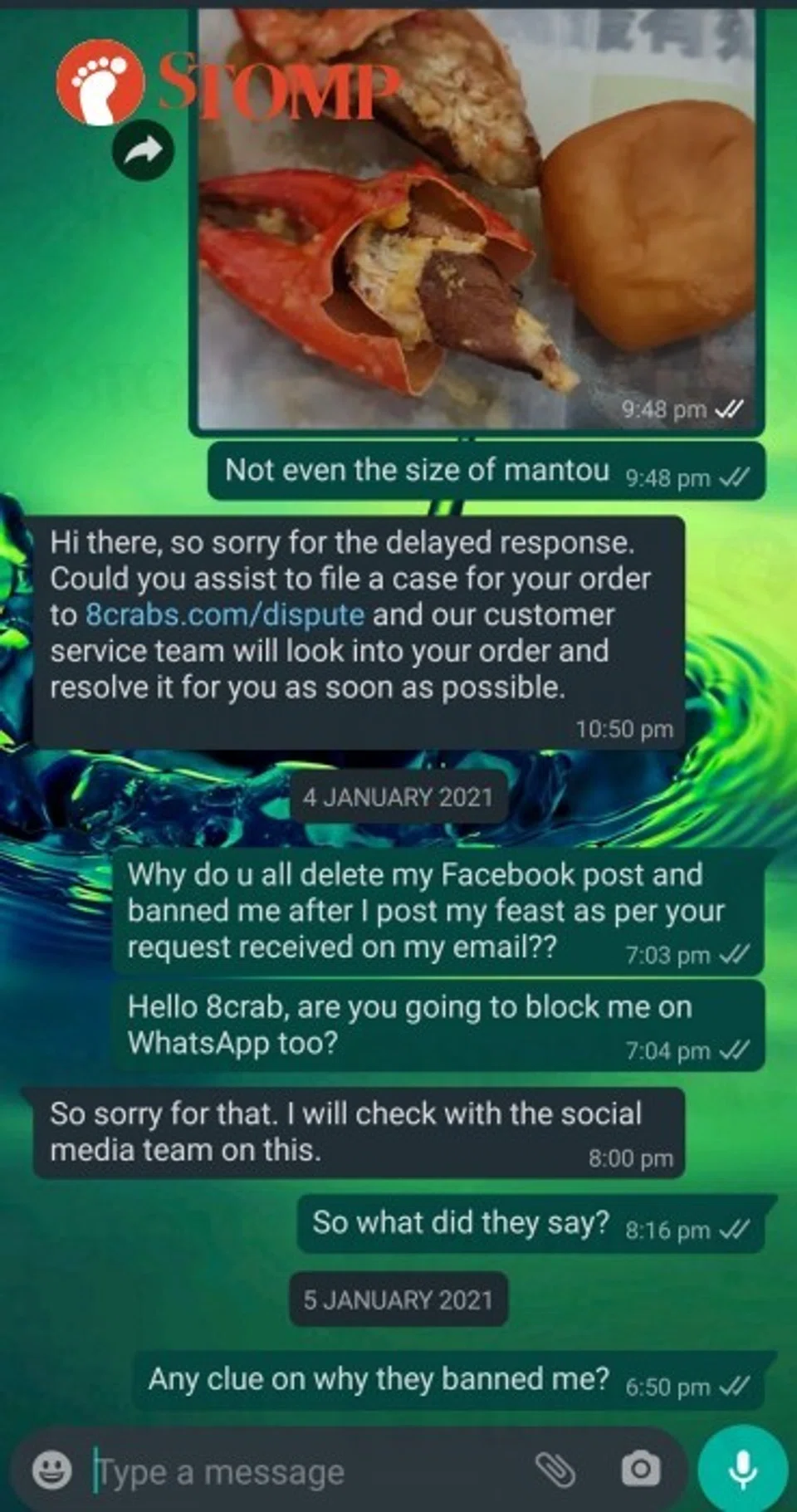 The third customer, Jack, shared his experience too, stating that the size of his crabs were "not even the size of a man tou".
