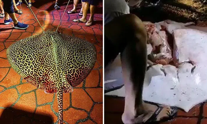On July 31, Facebook user Samantha Lee shared photos showing the bloodied leopard whipray. There were also videos of the creature being sliced open and its flesh being cut out.
