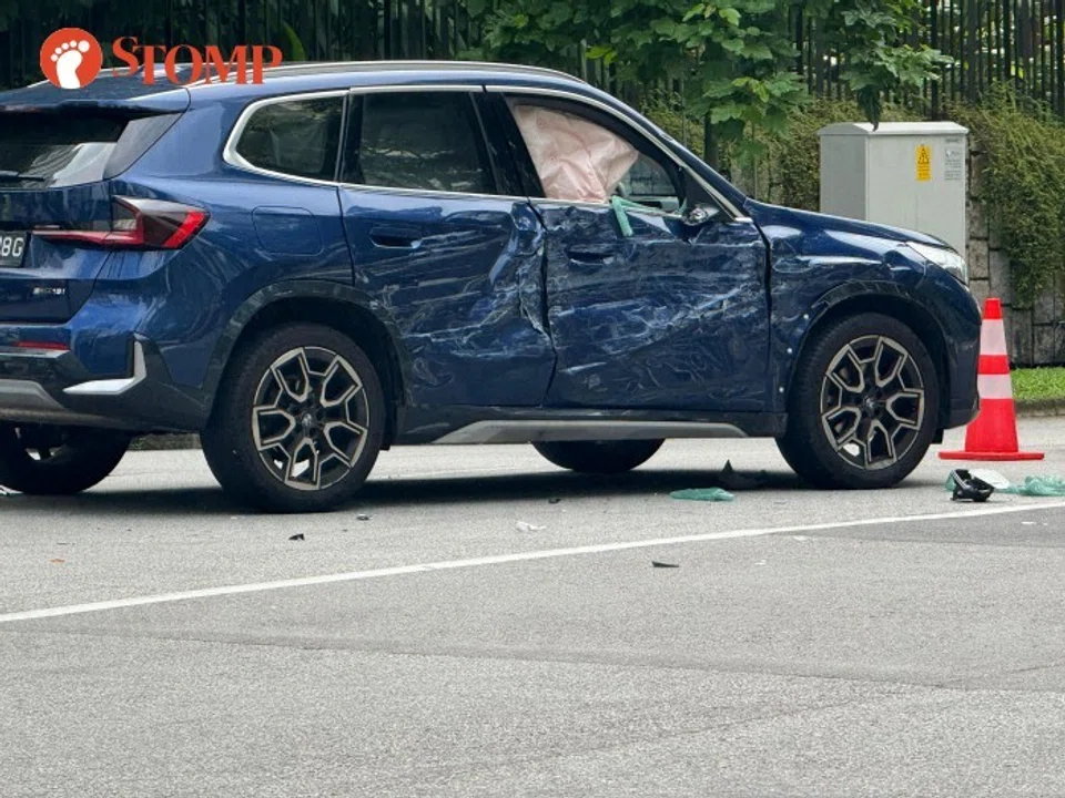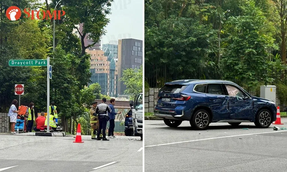 The accident, which involved a blue BMW and a white lorry, occurred between 10am and 10.30am. A Singapore Civil Defence Force (SCDF) ambulance and police officers were observed at the scene.