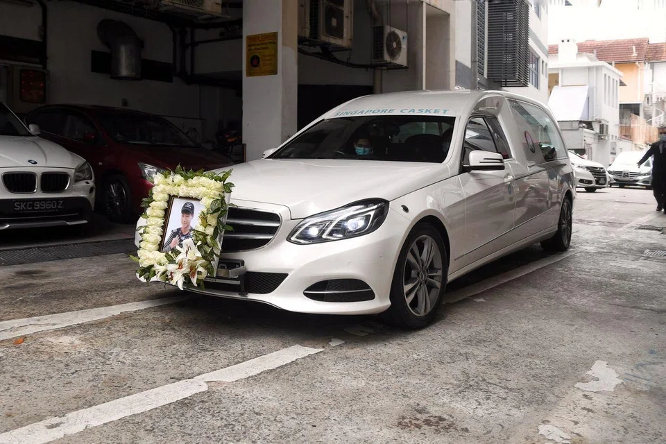 The cortege left Singapore Casket, where the wake for the Secondary 4 student had been held from last Friday, at about 11.30am on Feb 9, 2021. ST PHOTO: KUA CHEE SIONG