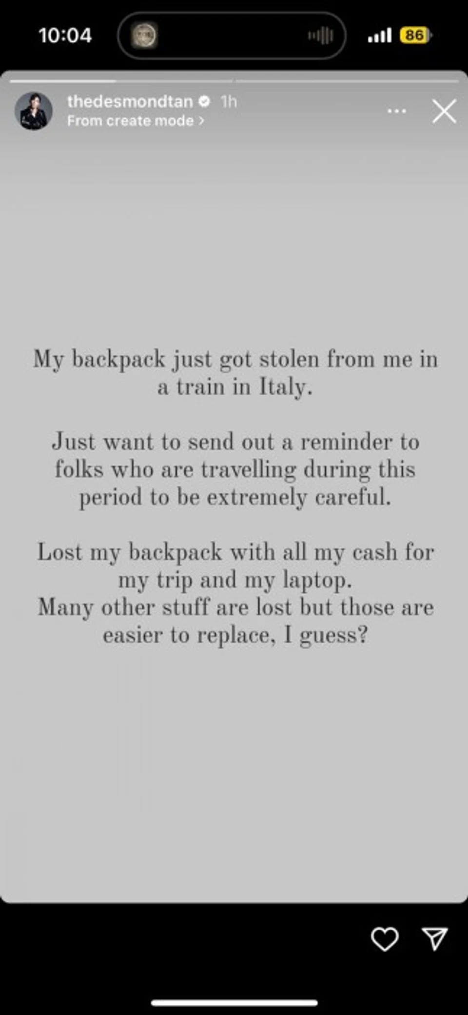 He posted an Instagram story on Monday (Dec 12) to share that his backpack was stolen while he was on a train. It contained cash and his laptop, along with other items.