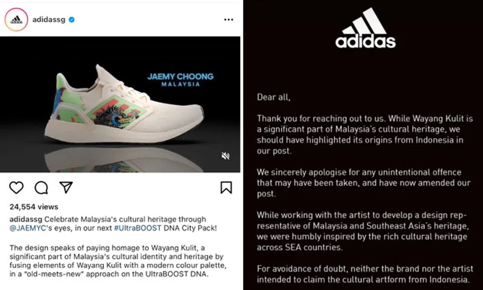 Adidas Singapore has apologised for overlooking the origins of wayang kulit, or shadow puppet theatre, in a recent Instagram post.