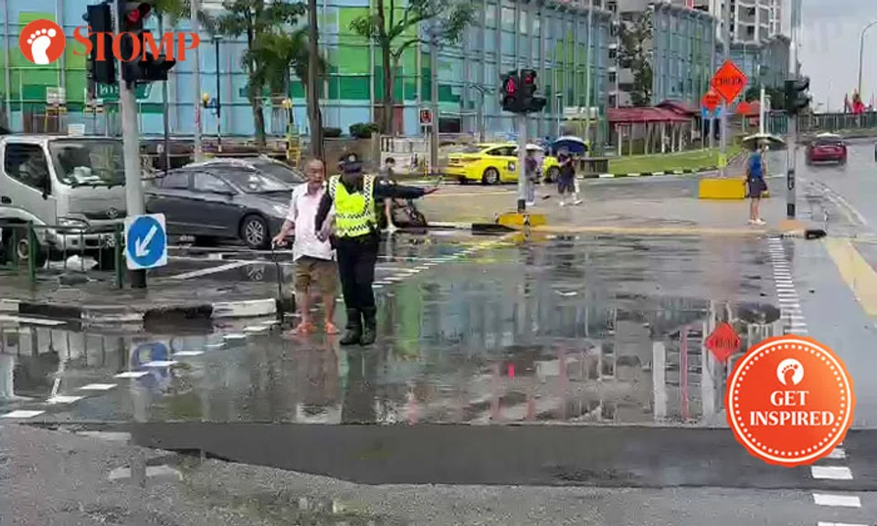 Aetos officer helps elderly man cross road in Ang Mo Kio despite being drenched by rain