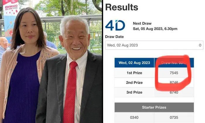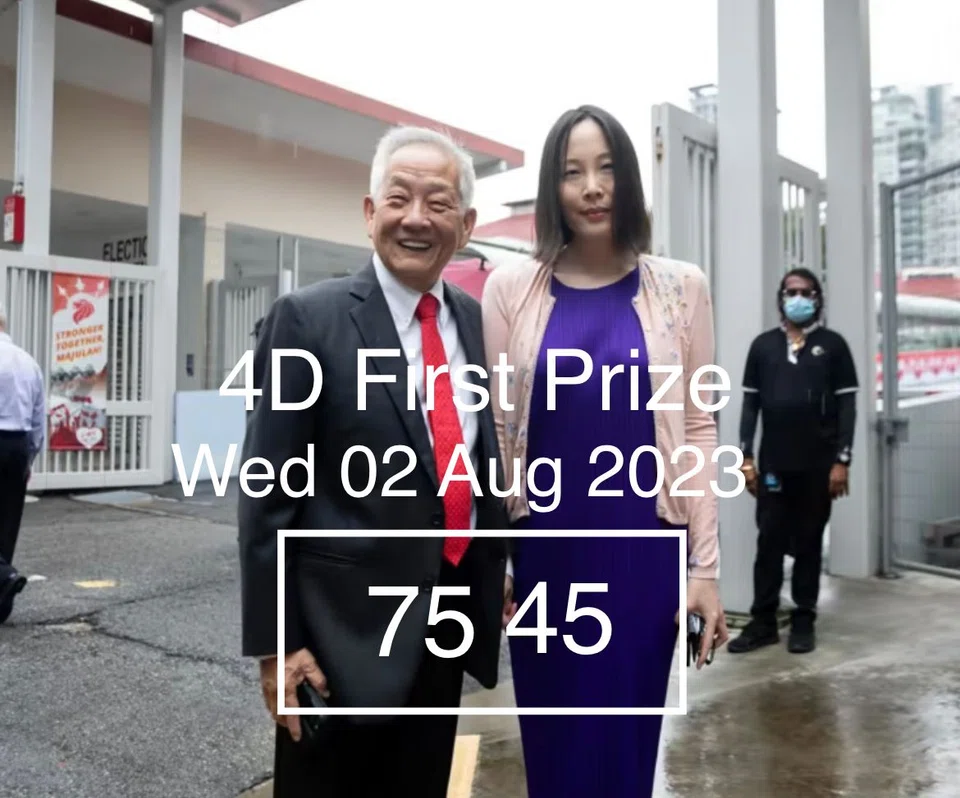 Sharp-eyed netizens have noticed that the first prize of Wednesday's (Aug 2) 4D results are the ages of 75-year-old presidential hopeful Ng Kok Song and his 45-year-old fiancee Sybil Lau.