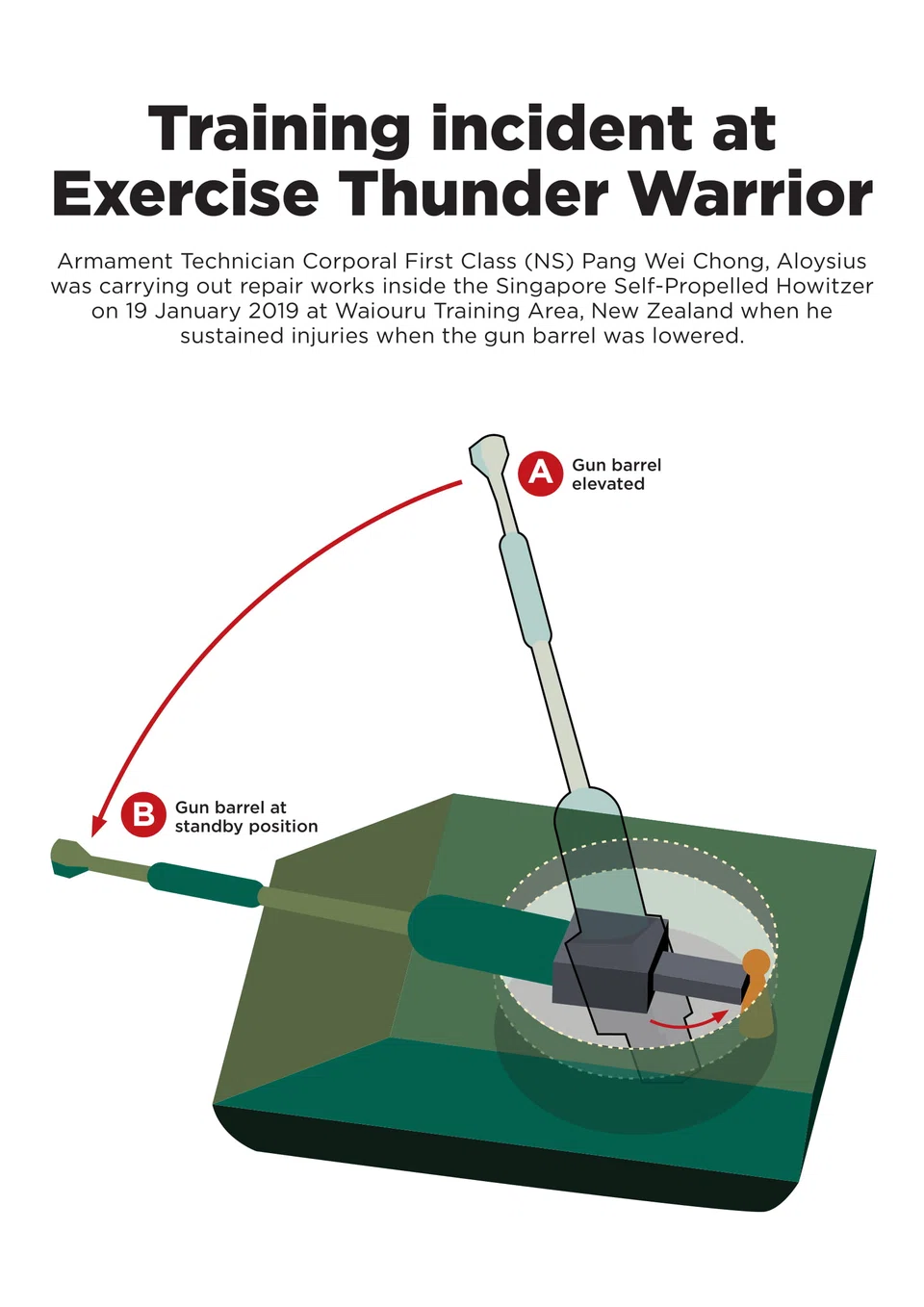 CFC (NS) Pang's formation chief, Colonel Terry Tan, told reporters that the lowering of the gun barrel is done within the cabin, and a "check clear" procedure needs to be followed whenever the barrel is lowered.