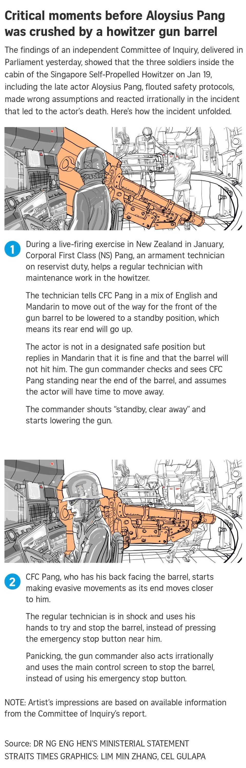 Only three soldiers, including the late Singapore actor Aloysius Pang, were present in the cabin of an artillery gun that was being rectified on Jan 19 this year, and each of them committed safety lapses that eventually led to his death, an independent Committee of Inquiry has found.