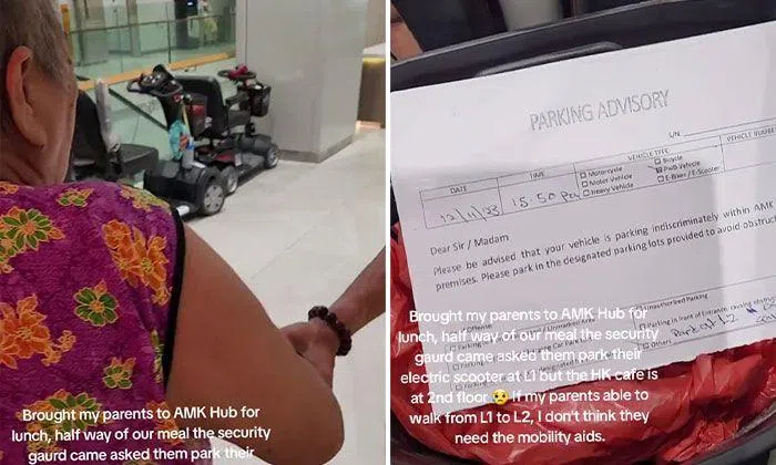 A man has called on malls to be “more lenient” to the elderly after a security guard asked his aged parents to park their personal mobility aids (PMAs) elsewhere during lunchtime.