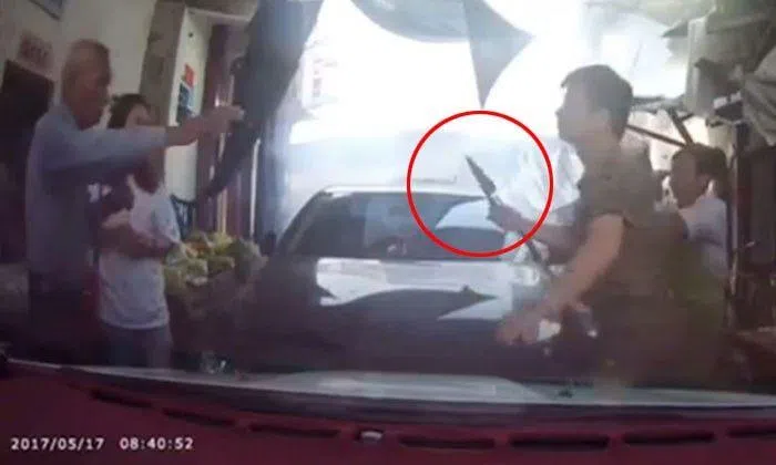 Things got a little more violent thereafter. The male driver alighted and picked up a knife at a stall beside his car. He pointed the sharp tool at the driver and a passerby who chided him for his actions.