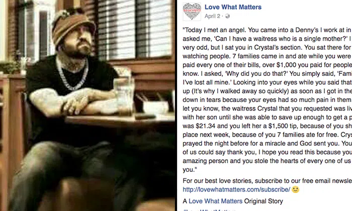 Anonymous man walks into family diner, foots the bill for other customers and tips single mom waitress whopping $1,500