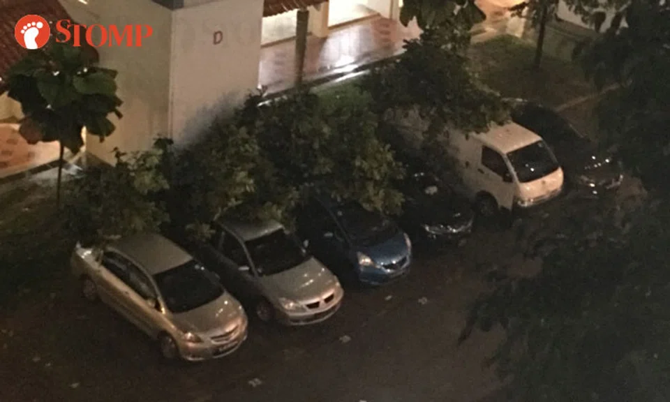 A tree uprooted and fell on a row of parked cars at Block 752 Yishun Street 72 today (Jan 12) at around 1.07am.