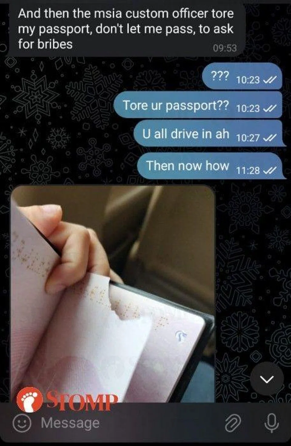 "However, the JB customs officer said my sister could not pass because her passport was torn. He said they had to pay him RM200 and he would let her pass.