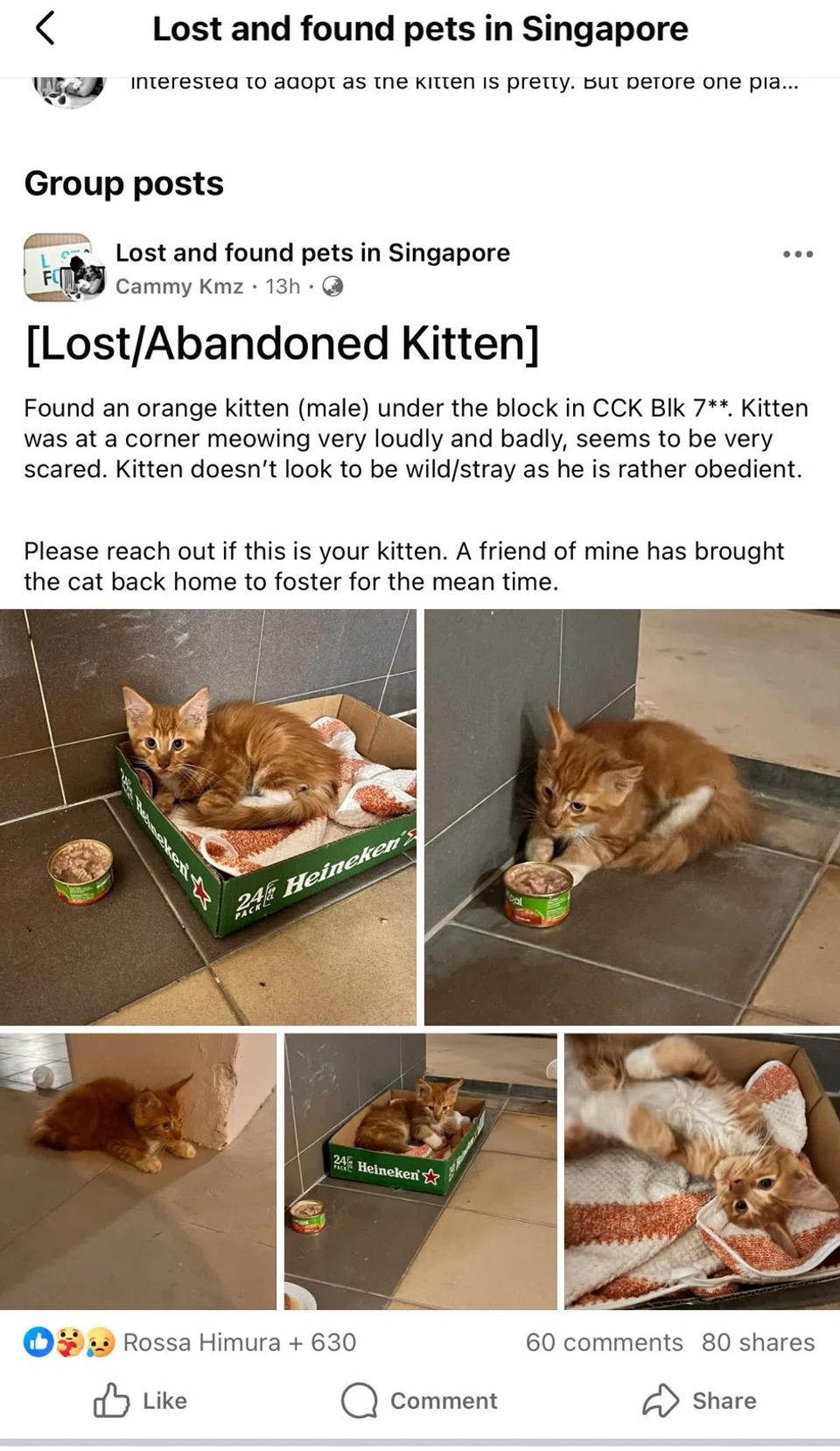 At about 2pm, before printing out posters, Emellia said she checked the Facebook group Lost and found pets in Singapore and discovered a post by a user named Cammy Kmzz, who had allegedly found a kitten that resembled hers.